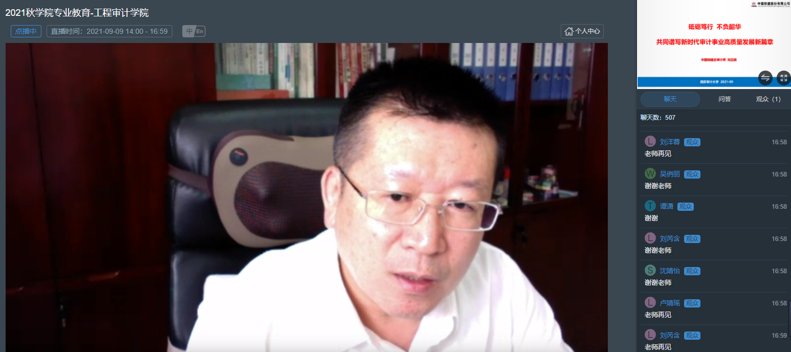 接着刘正昶总审计师从初创期、发展期、初步成熟期和成熟期四个阶段详细分析了中国铁建审计发展历程,并结合公司业务重点介绍审计事业发展的“四个坚持”理念,即坚持强化顶层设计、坚持体制机制建设、坚持规范制度行为、坚持创新转型升级、坚持学习沟通交流、坚持规范基础建设,强调审计遵循系统科学、审计质量持续提升、审计价值全面彰显、审计服务精准有力等推进审计事业成熟发展。近期结合“十四五”规划进一步推进审计事业发展,提出审计工作基本指引:业审结合,提供最佳实务咨询;审审结合,形成审计合力;审改结合,提升审计监督效能;审技结合,提高审计质量和效率。以审计实务及未来规划为同学们将来的学习提供了目标与方向。