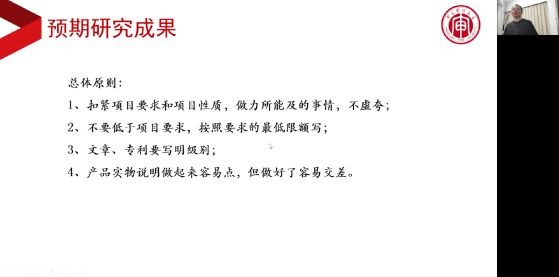 葛世龙强调撰写项目申请书时,要点明做这个选题的意义以及具体做法。碰到难题时,团队成员要相互沟通,进行头脑风暴。作为组长,更应该做到收集大家的观点,并做出整合。此外,一份好的开题报告包含了明确的研究目标、详实的研究内容、恰当的研究方法与清晰合理的研究过程,要注意突出重点、创新点以及对困难的准确的预判和解决措施。