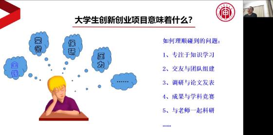 葛世龙强调撰写项目申请书时,要点明做这个选题的意义以及具体做法。碰到难题时,团队成员要相互沟通,进行头脑风暴。作为组长,更应该做到收集大家的观点,并做出整合。此外,一份好的开题报告包含了明确的研究目标、详实的研究内容、恰当的研究方法与清晰合理的研究过程,要注意突出重点、创新点以及对困难的准确的预判和解决措施。