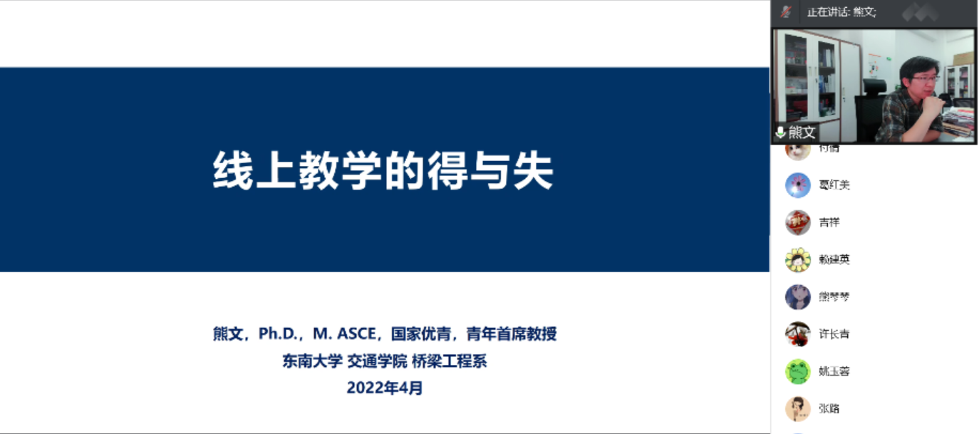 4月27日下午,williamhill英国教师网络教学能力培训与线上教学经验分享月系列活动——“线上教学的得与失”在线上进行。本次活动特邀东南大学交通学院桥梁工程系教授熊文为学院教师作专题报告与交流,活动由副院长葛世龙主持。