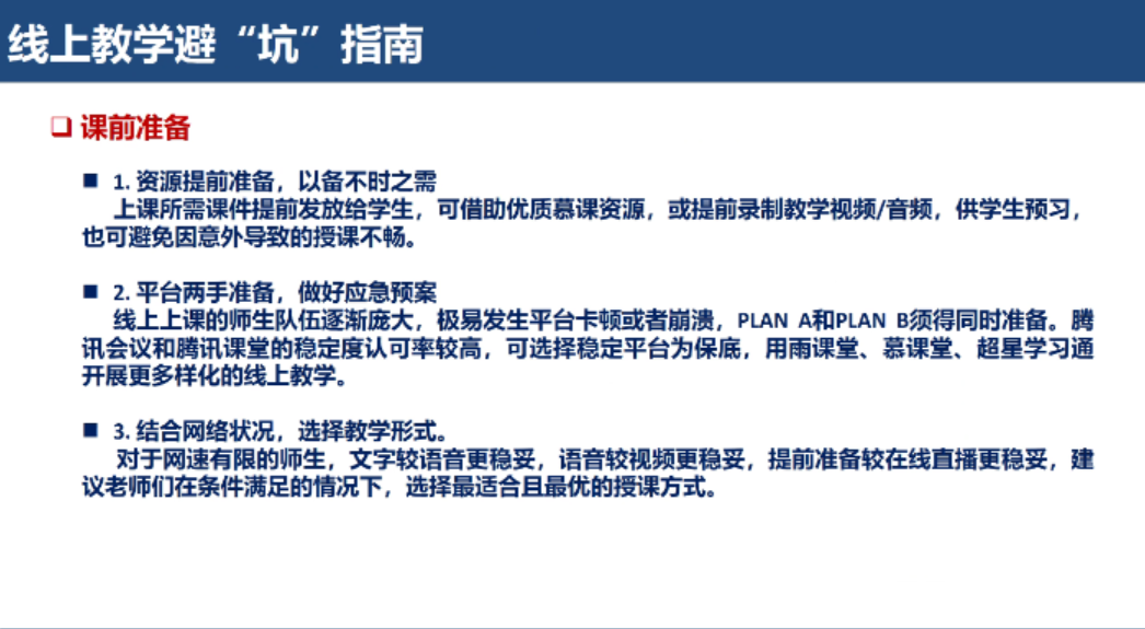 熊文指出,线上教学很重要的一点在于如何吸引学生的注意力,应在课堂融入能够带动学生参与互动的元素。他列举了一些增强课堂互动效果的方法,比如随机提问与拓展式提问、发动学生投票或讨论等方式。另外,线上教学要充分利用其他平台的各种资源,比如MOOC课、SPOC、出版社提供的电子版教材等,针对不同在线教学工具的特点进行灵活运用。他还分析了“问题导向”型教学与传统教学方式的利弊,提出要注重聆听学生对教师授课情况的反馈评价等。最后,他以一个“线上教学避‘坑’指南”作为总结,为学院老师们提供了很好的参考。