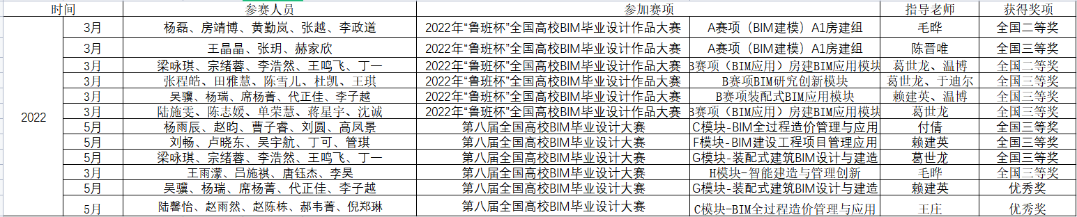 近日,第八届全国高校BIM毕业设计大赛和2022年“鲁班杯”全国高校BIM毕业设计作品大赛成功举办。经过6个月的认真备赛,BIM学社社员斩获了众多奖项。其中,广联达比赛共七组参加,C模块-BIM全过程造价管理与应用荣获全国三等奖和优秀奖,D模块-BIM招投标管理与应用荣获全国三等奖,F模块-BIM建设工程项目管理应用荣获全国三等奖,G模块-装配式建筑BIM设计与建造荣获全国三等奖和优秀奖,H模块-智能建造与管理创新荣获全国三等奖;“鲁班杯”比赛共六组获奖,荣获A赛项(BIM建模)房建组全国二等奖和全国三等奖,B赛项(BIM应用)房建BIM应用模块荣获全国二等奖和全国三等奖,装配式BIM应用模块荣获全国三等奖,BIM研究创新模块荣获全国三等奖。