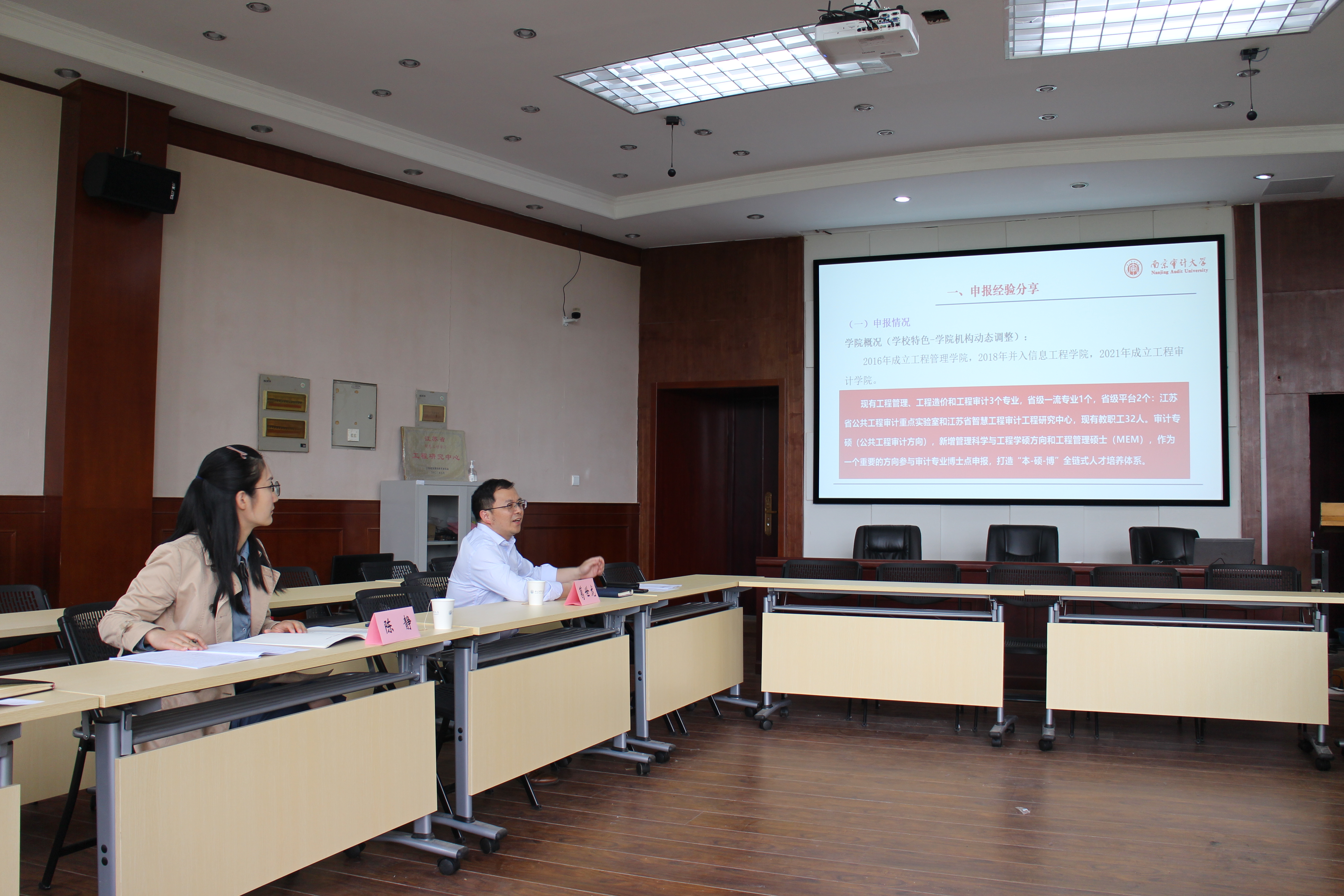 葛世龙代表学院对来访领导表示了热烈的欢迎,并向对方简要陈述了学院的历史变迁、发展过程和目前的专业设置情况。在MEM硕士点申报经验分享环节,他首先对申报的总体过程进行介绍,然后对申报书填报细节做了细致的分析,详细讲解了申报条件自查表的各项内容,强调在叙述建设硕士点必要性时要突出思政教育、立德树人的内容。最后,他提出要加强与教育厅的沟通,合理安排时间节点,邀请专家同行评审论证,充分调动学校学院资源来组织申报。