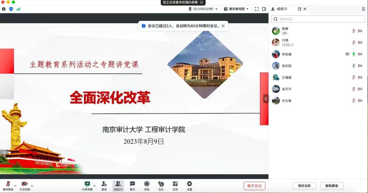 为进一步贯彻落实习近平新时代中国特色社会主义思想主题教育,8月9日上午,工程审计系支部在线上开展“全面深化改革”专题党课学习会。williamhill英国党总支副书记(主持)徐庆阳,工程审计系全体党员参加会议。会议由党支部书记付倩主持。