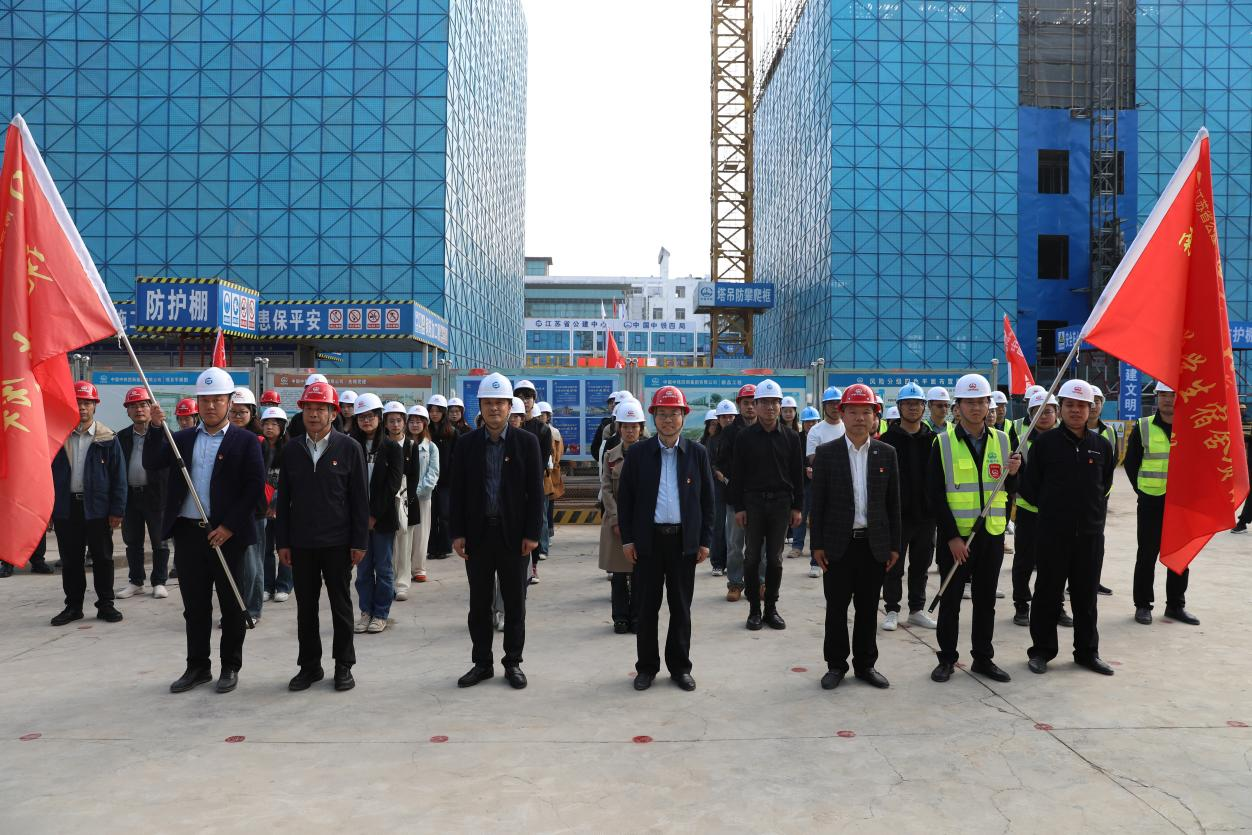 会后举行了授旗仪式,任志成、沈志刚分别为“党员先锋队”和“工程突击队”授旗。随后,中铁四局南京分公司工程师带领学院师生代表30人参观了宿舍施工现场,并进行了答疑交流。