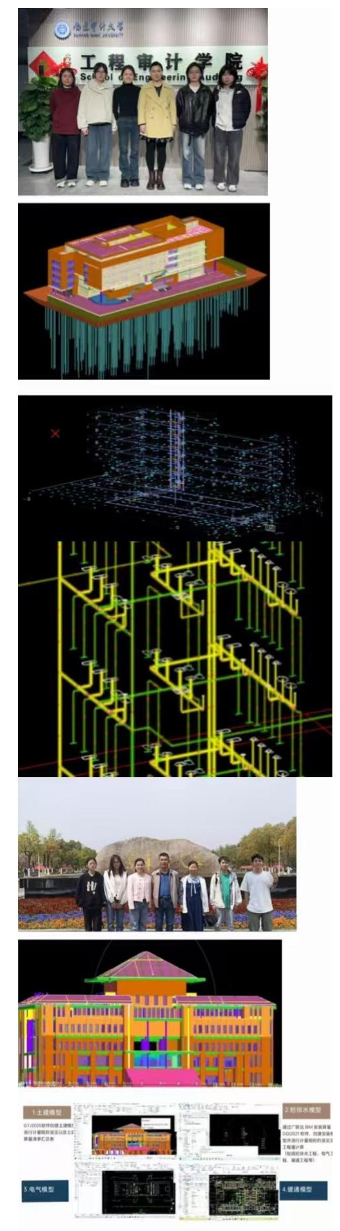国际高校 BIM 毕业设计大赛是由中国土木工程学会建筑市场与招标投标研究分会,广联达科技股份有限公司主办的权威赛事,竞赛分为 8 个赛项,分别为 A 模块—建筑设计 BIM应用与创新、B 模块—机电设计 BIM 应用与创新、C 模块—道桥设计 BIM 应用与创新、D 模块—BIM 建筑碳排放计算与减碳设计、E 模块—施工深化设计建模与应用、F 模块—BIM+工程项目管理应用、G 模块—BIM+全过程造价管理与应用、H 模块—BIM+装饰造价全过程应用。今年共有 700 余高校的 14000 余队伍参赛。我院参加作品将 BIM 技术与工程审计深度融合,展现“工程+审计+数字化”的复合培养特色。