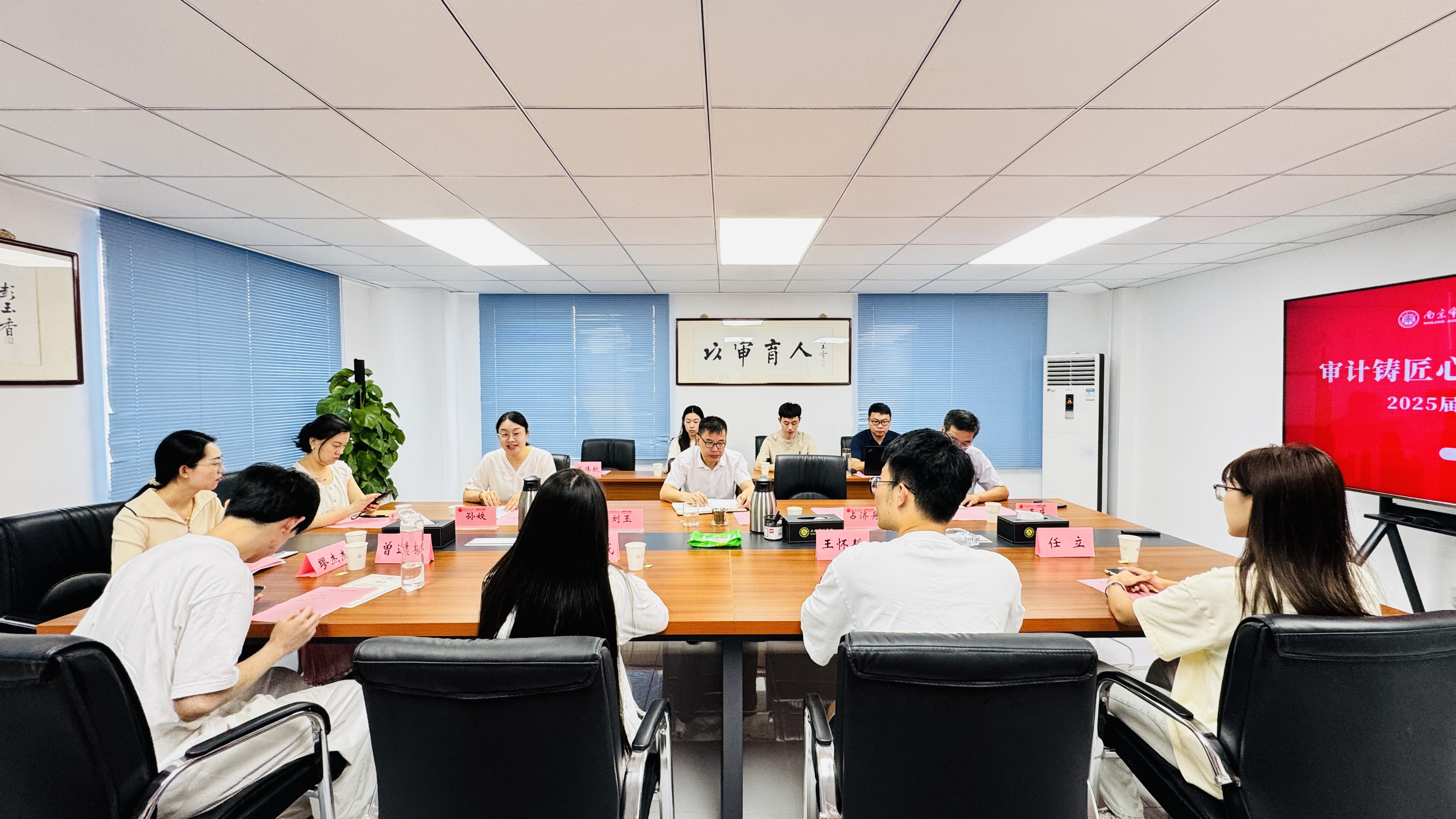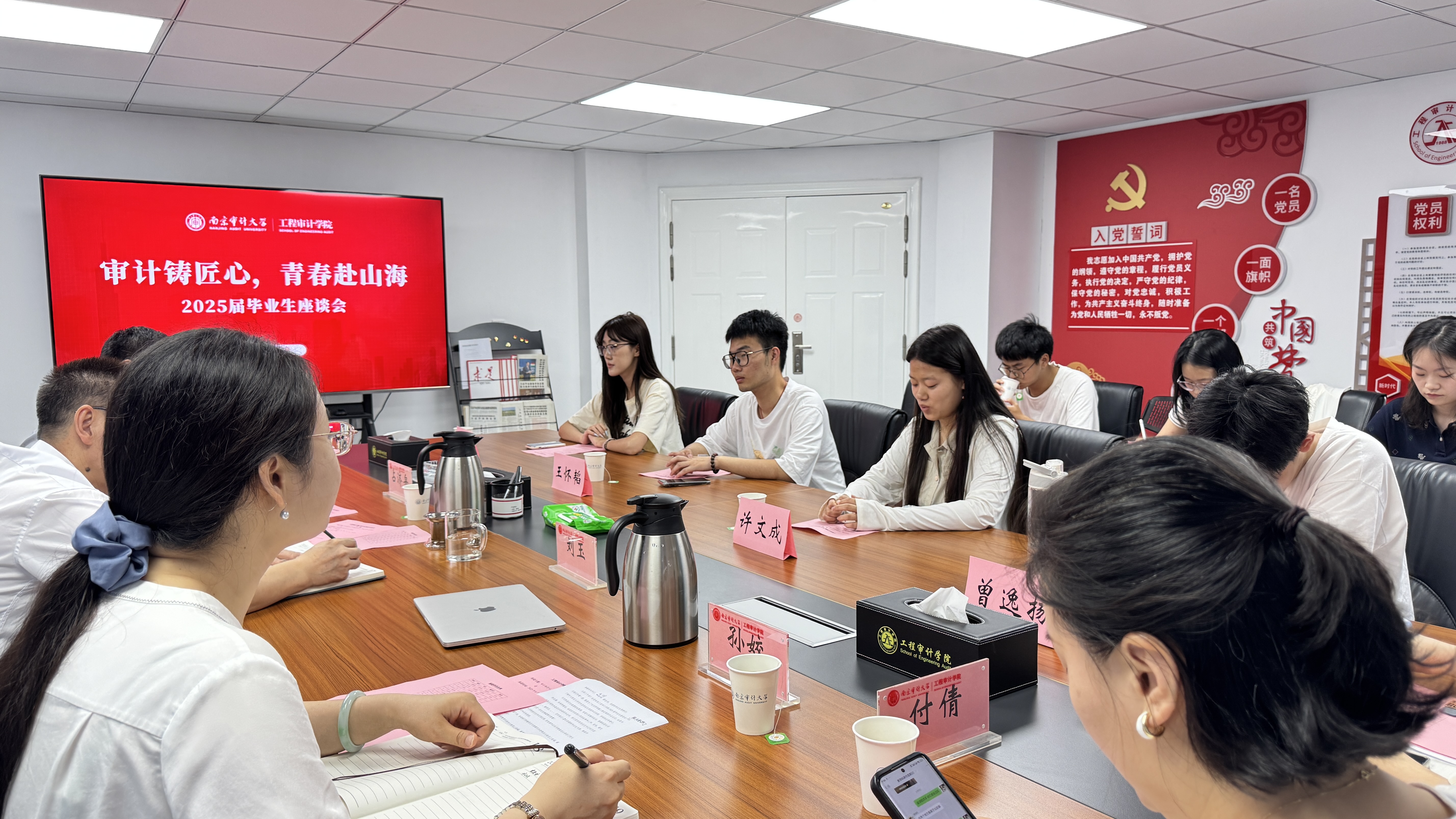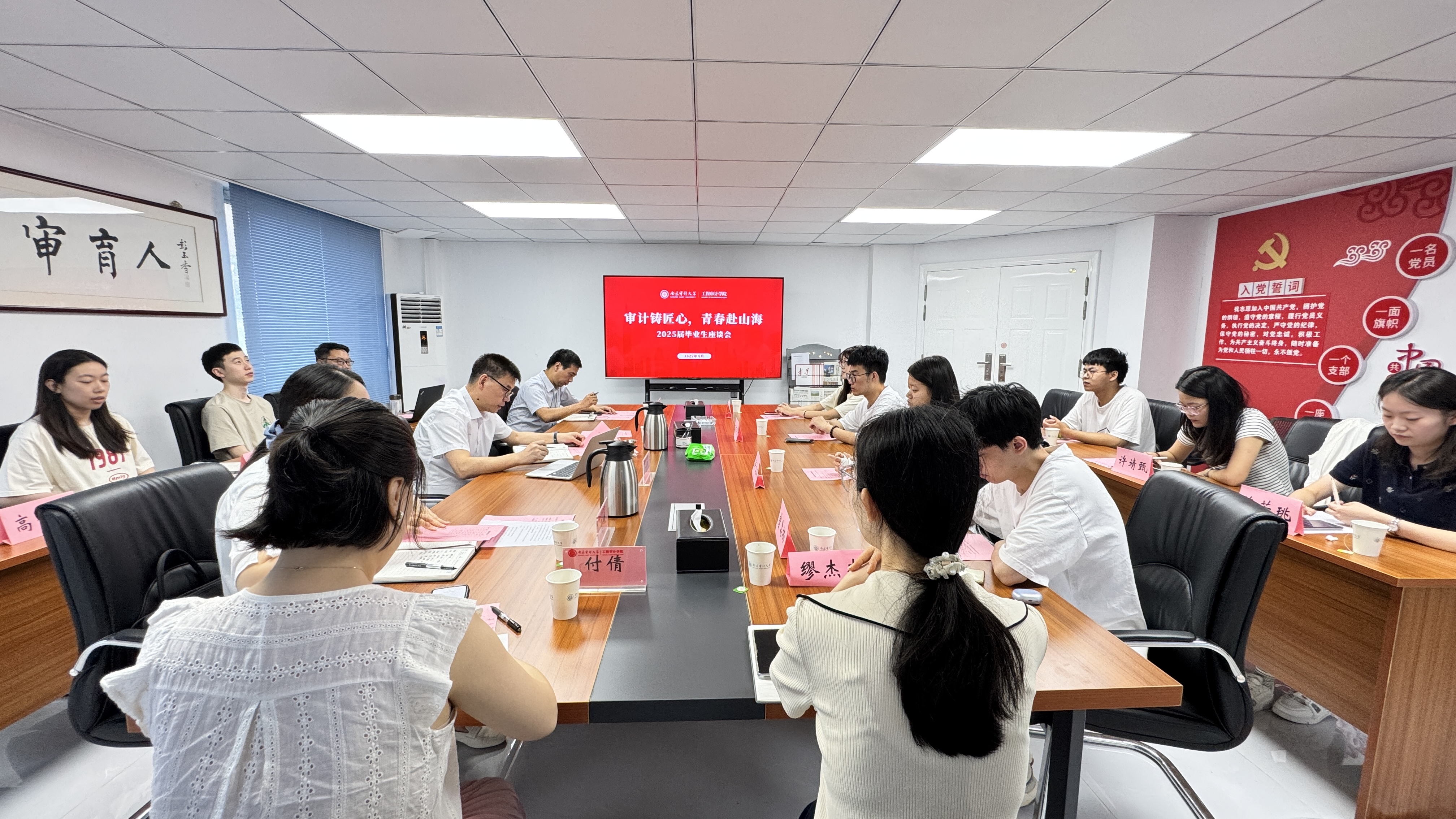 座谈会的最后,全体师生合影留念,镜头定格下灿烂的笑容与难忘的瞬间。这场座谈会不仅是一次告别,更是一次精神的传承。毕业生们带着师长的嘱托和同窗的祝福,即将踏上新征程,以“审计铸匠心”的专业态度奔赴“青春山海”的广阔天地。