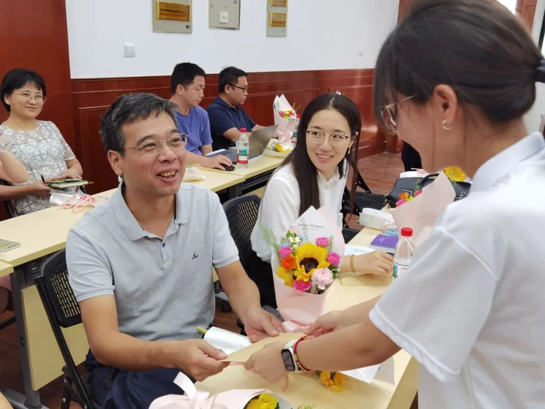 朱恒金手捧“光荣在岗25年”鲜花,历数学校三易校名、学院三次跃迁,“招牌在变,团结向上的基因不变”,寄语“老教师越活越年轻,学院明天更辉煌”。