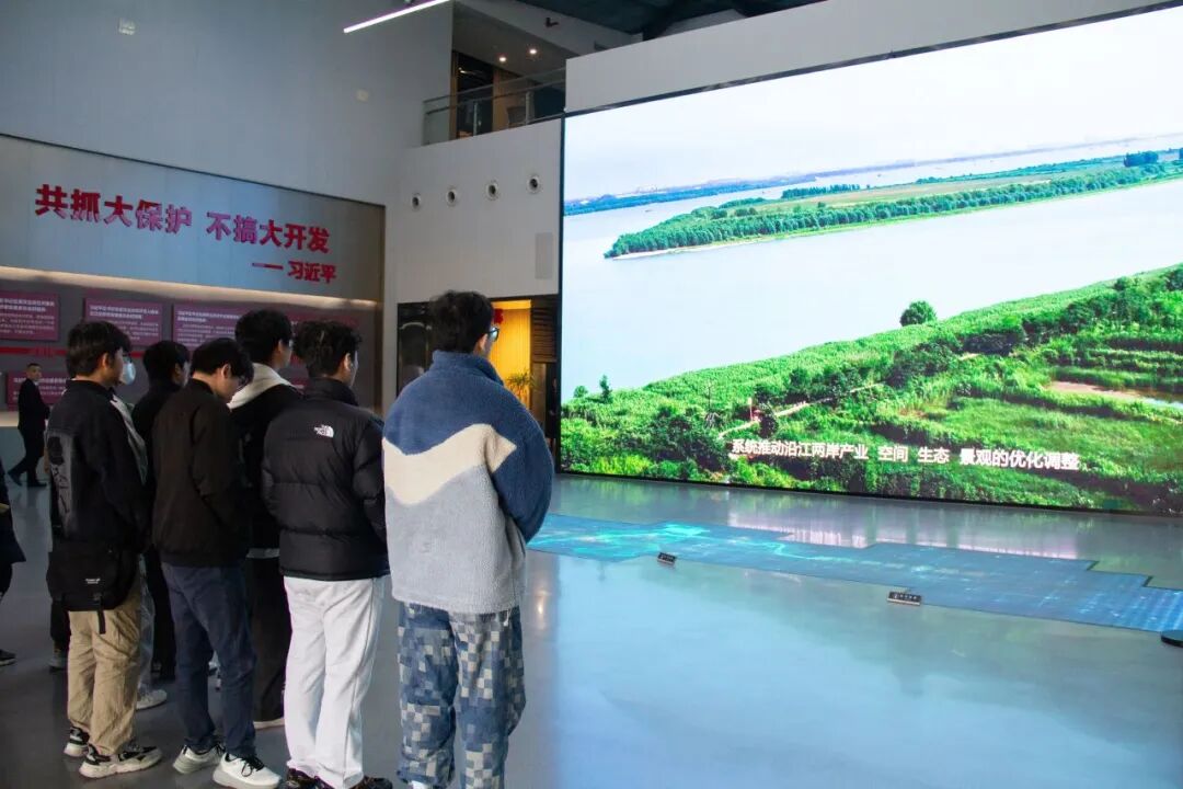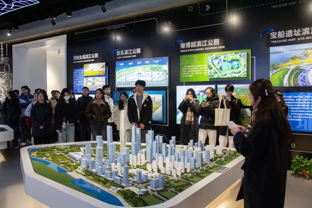 上午9时30分,参与活动的学生党员代表准时抵达位于建邺区江堤路的南京滨江规划建设展示中心。在讲解员的引导下,大家共同参观了“活力滨江·生态建邺”青年学习社线路。通过图文展板、沙盘模型、多媒体影像等多种形式,党员们深入了解了滨江区域从工业岸线向生态岸线、生活岸线、景观岸线转型的历程,切身感受建邺区在推动高质量发展与生态文明建设协同并进中的生动实践。大家边走边看、边听边思,对“绿水青山就是金山银山”的发展理念有了更加直观和深刻的理解。