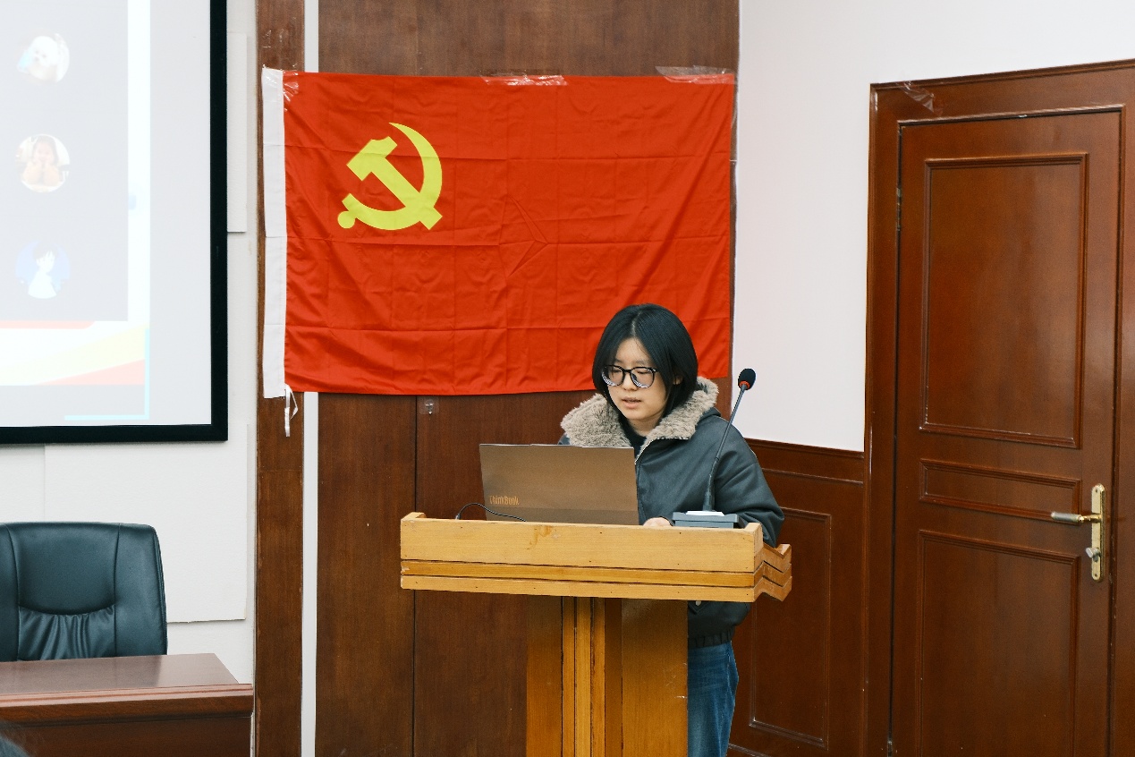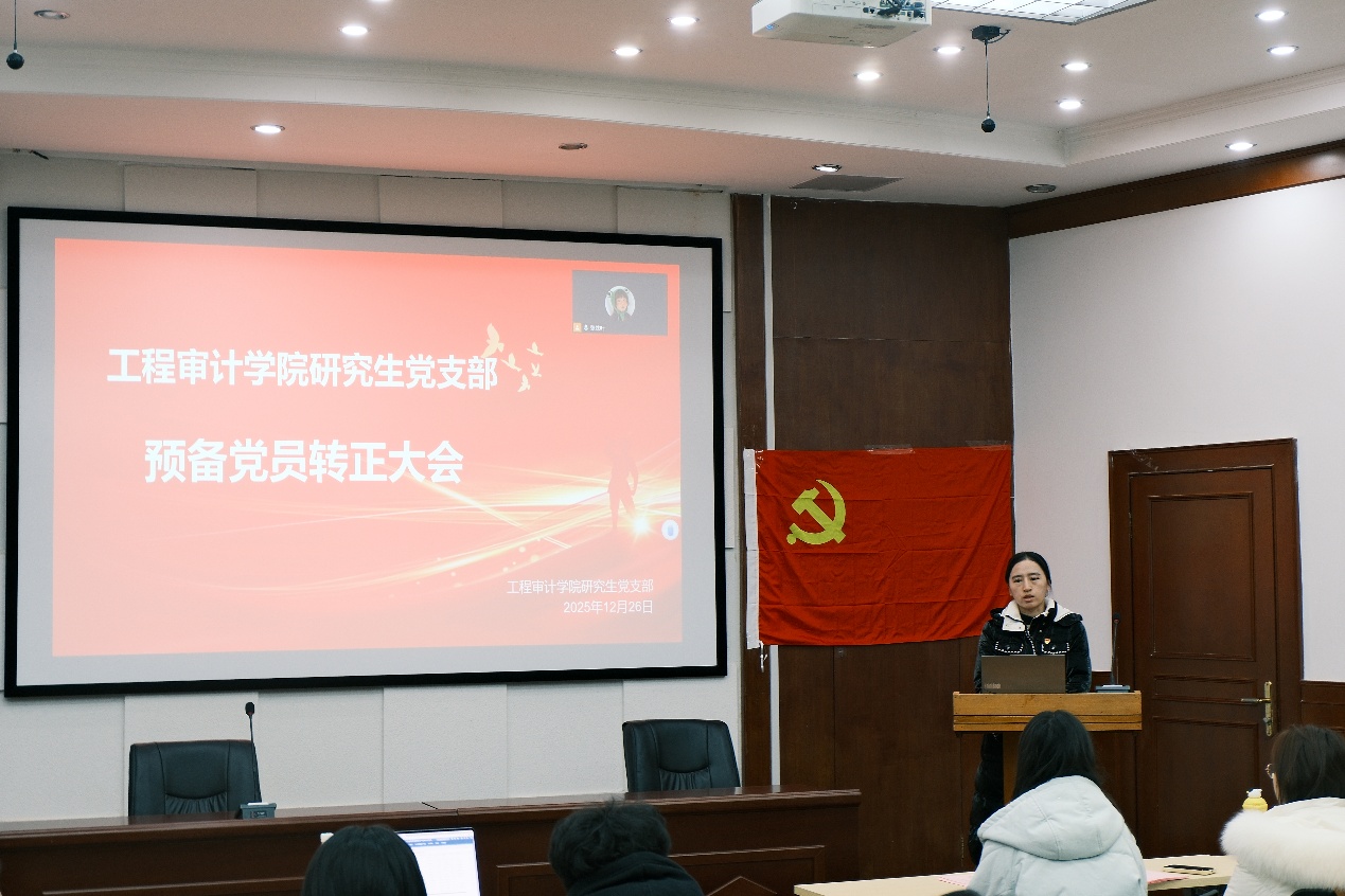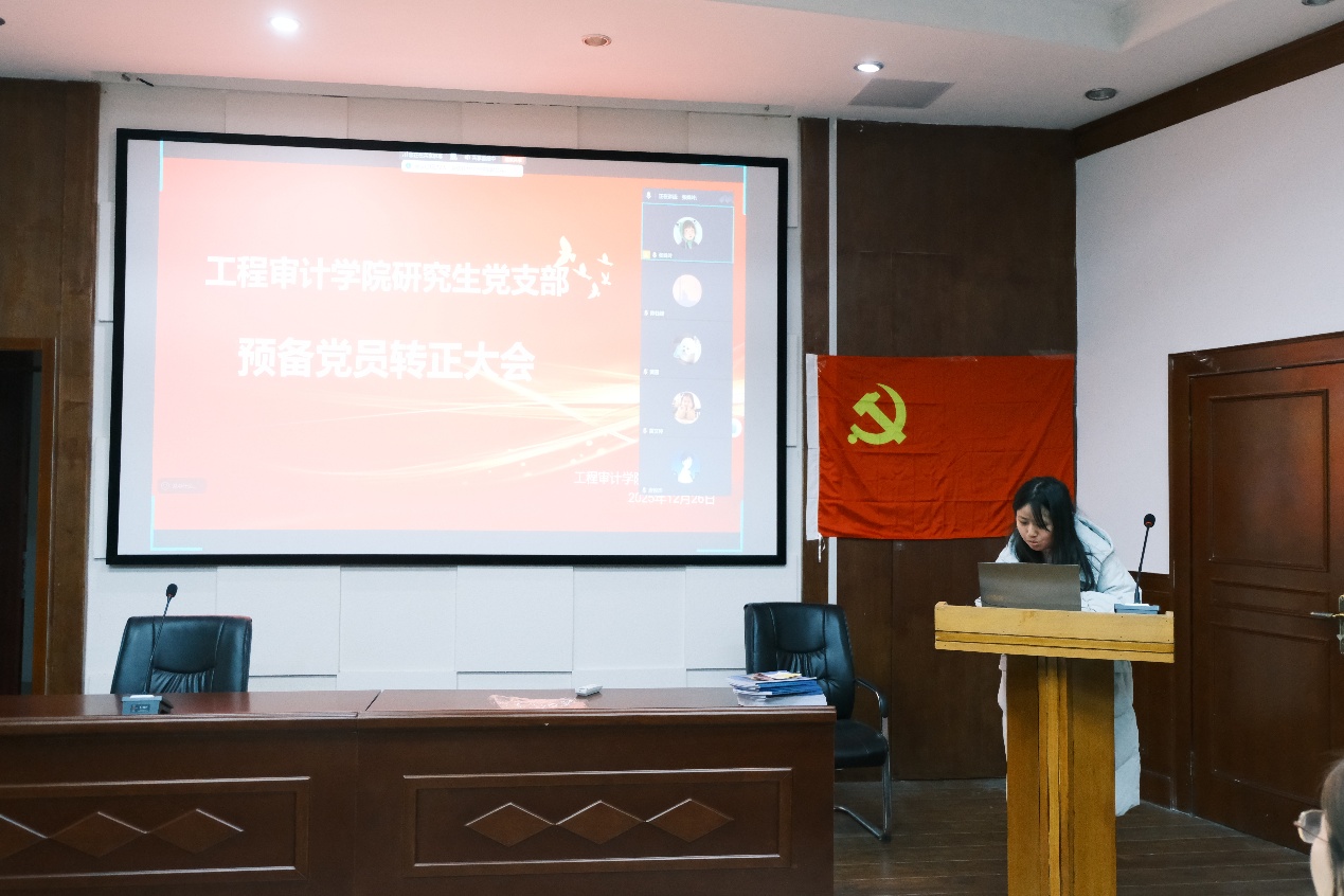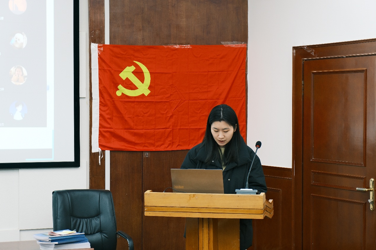 随后,五名培养联系人结合日常考察情况,逐一发言。他们客观公正地陈述了各自联系的转正对象在预备期内遵守党章党规、参与组织生活、改进自身不足等方面的具体表现。党支部组织委员蒋姗同志代表支委会作审查情况报告。报告从思想汇报及组织生活参与情况审核、学业科研及群众意见征集情况、转正公示结果三个方面进行了详细说明,并正式提出支委会同意五名同志按期转正的初步意见。