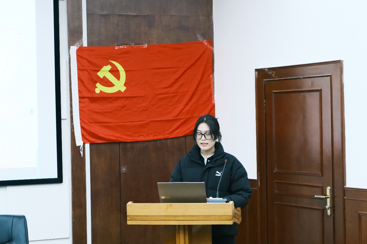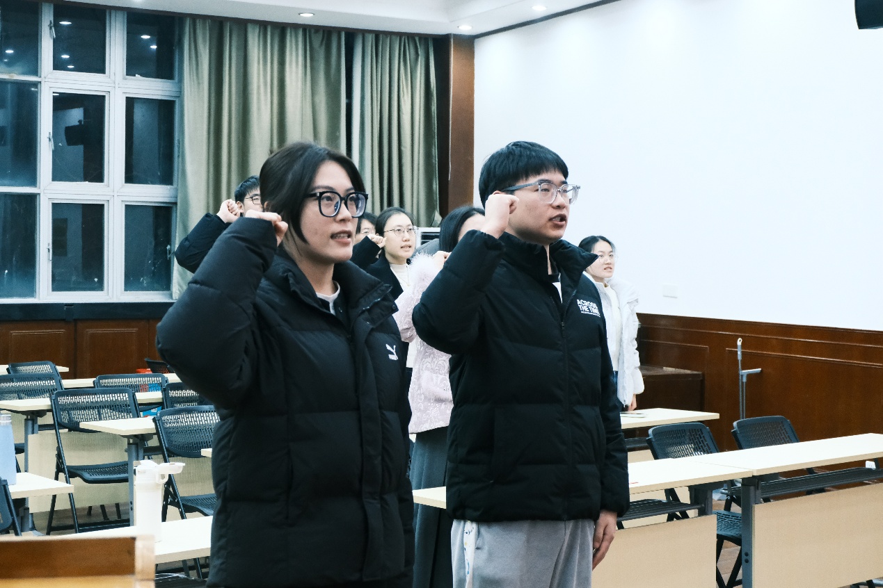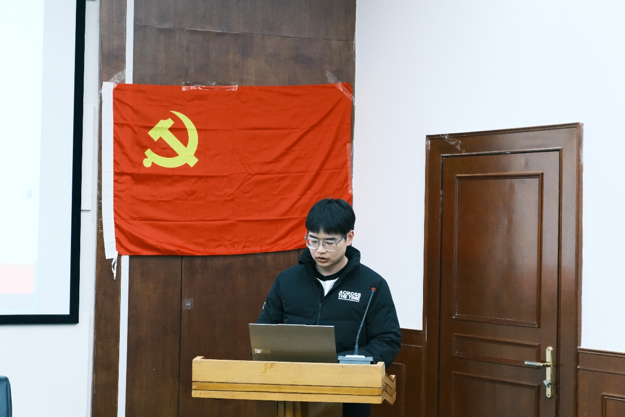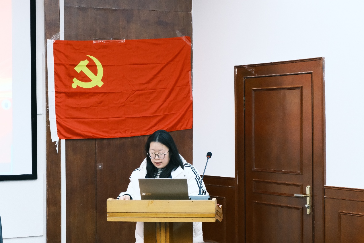 宣誓结束后,大会进入第二项议程领学环节。张姝叶、蒋珊、黄诗雨、王筱涵四位支部委员带领全体党员集中学习党章、习近平新时代中国特色社会主义思想及党的路线方针政策等重要内容,结合党员培养教育实际,进一步强化了全体党员的党性修养和理论素养,为支部建设筑牢思想根基。