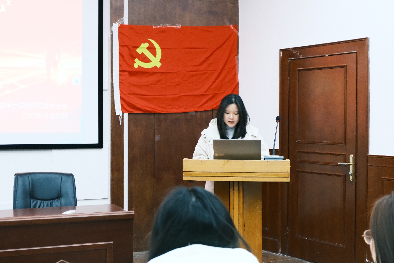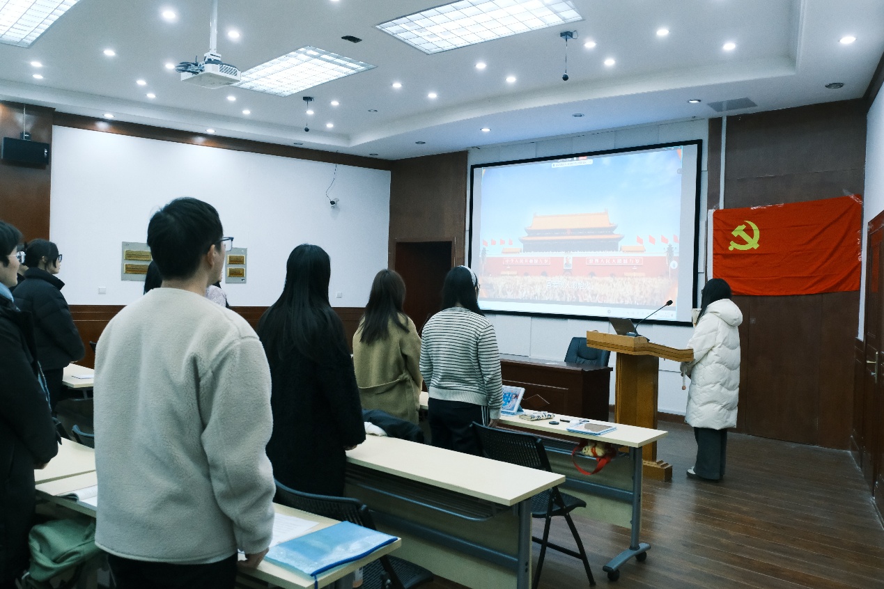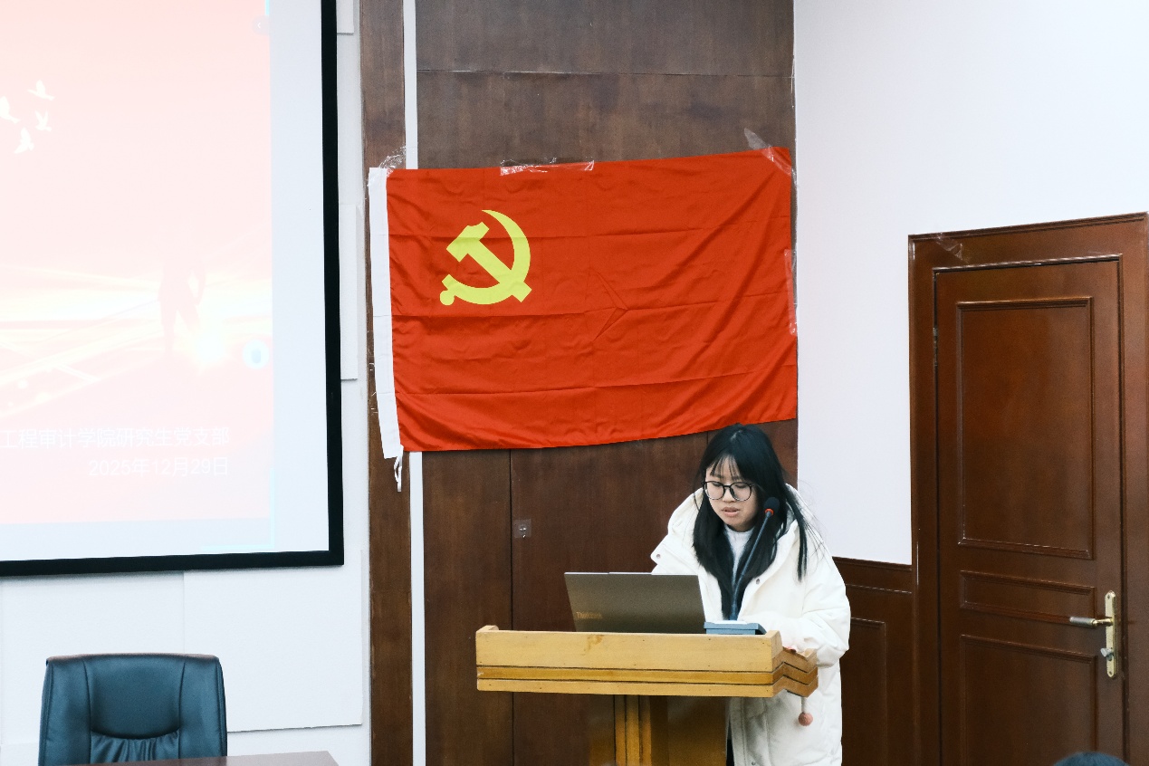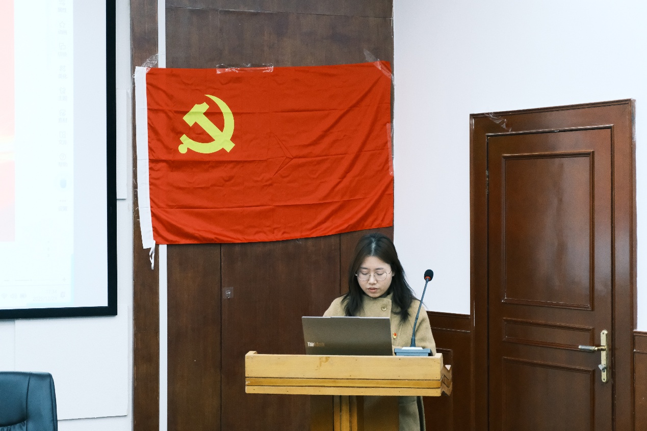 宣誓结束后,大会进入第二项议程领学环节。张姝叶、蒋珊、黄诗雨、王筱涵四位支部委员带领全体党员集中学习党章、习近平新时代中国特色社会主义思想及党的路线方针政策等重要内容,结合党员培养教育实际,进一步强化了全体党员的党性修养和理论素养,为支部建设筑牢思想根基。